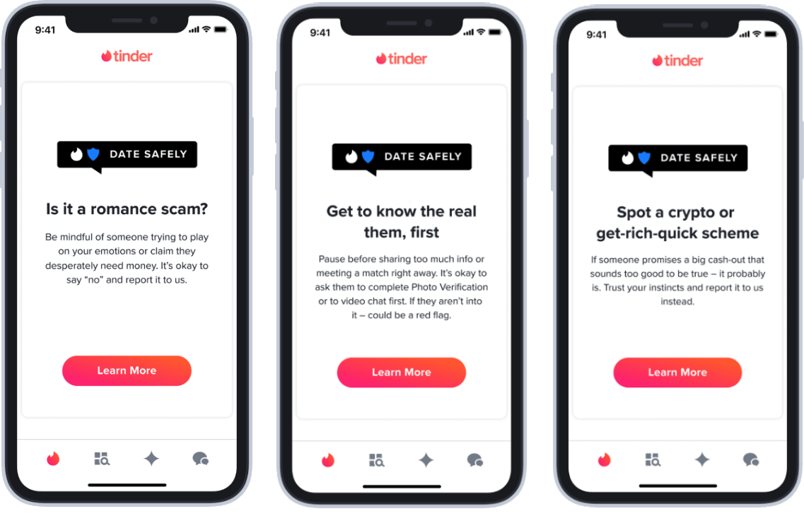 In den letzten Jahren erfreuen sich Liebesbetrug immer größerer Beliebtheit. Die Match Group hat Schritte unternommen, um potenzielle Betrügereien zu verhindern und Benutzer vor potenziellen Betrügereien zu warnen, indem sie KI-Tools nutzt, um Wörter und Phrasen zu erkennen und proaktiv einzugreifen. Wir haben außerdem verschiedene Möglichkeiten implementiert, um Benutzer vor potenziellen Betrügereien oder Betrügereien zu warnen, von In-App-Funktionen über In-App-Schulungen bis hin zu Popup-Nachrichten. Um die Nutzer weiter darüber zu informieren, wie sie sich in unseren Apps und auf allen Online-Plattformen schützen können, haben wir mit Strafverfolgungsbehörden und Ermittlern für Cyberkriminalität auf der ganzen Welt zusammengearbeitet, um eine Aufklärungskampagne für Verbraucher über die verschiedenen Arten von Betrug und die Erkennung gängiger Verhaltensweisen zu erstellen .